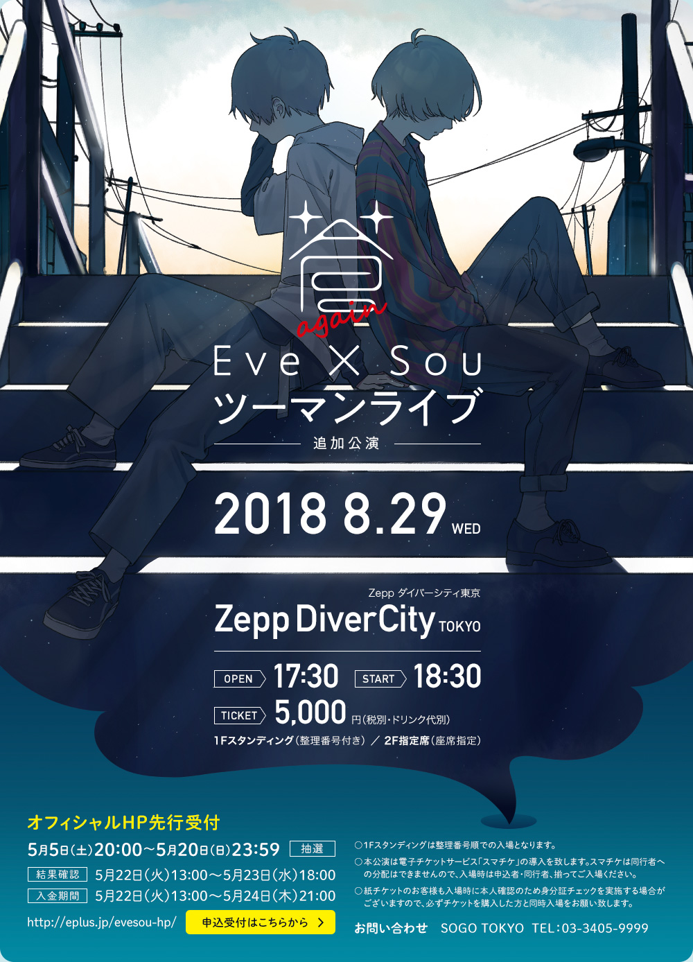 - 5月5日(土) Eve×Souツーマンライブ『蒼』のチケットはSOLD OUTいたしました。当日券の販売予定はございません。
